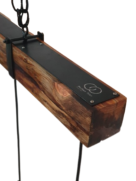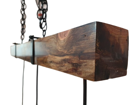 Lámpara colgante, fabricada a mano, madera, metal, vidrio y resina epoxy, incluye focos ahorradores led tipo ampolleta.