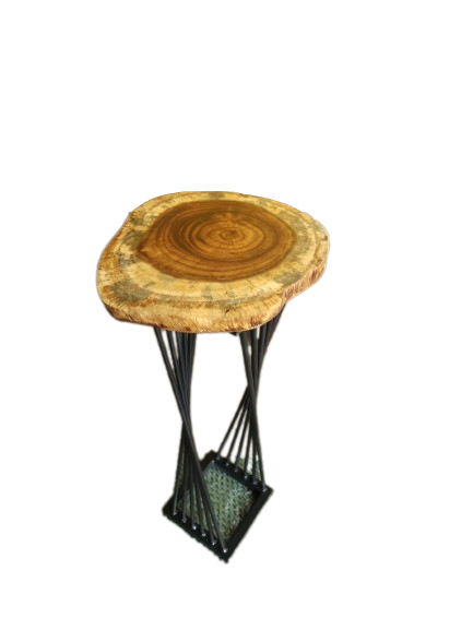 Pedestal ideal para los rincones de tu hogar, diseño fabricado en acero, acabado negro satín con cubierta en rodaja de madera de Parota.